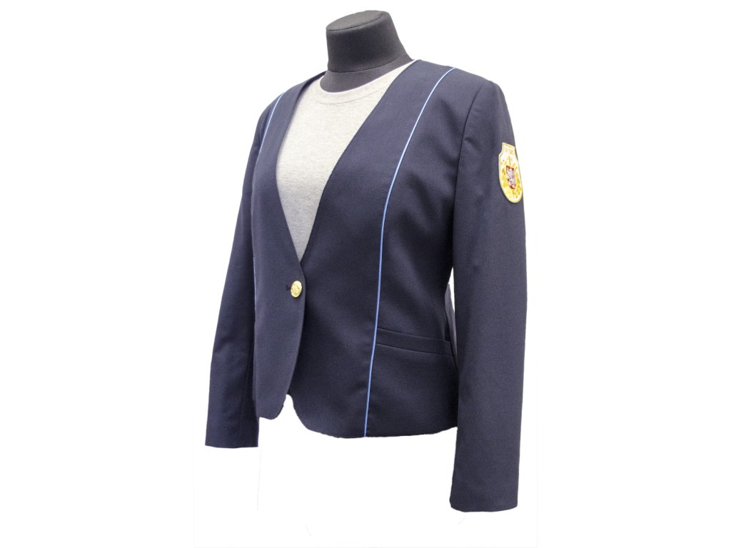 Elegantní dámské sako v tmavě modré barvě s jemným světle modrým lemováním, které dodává celkovému vzhledu nadčasovou a upravenou siluetu. Sako má otevřený výstřih bez klasických klop, jeden decentní zlatý knoflík pro zapnutí a hladkou podšívku pro pohodlné nošení. Na rukávu se nachází ozdobná nášivka, která modelu dodává stylový, lehce uniformní nádech. Skvěle doplní jednoduché šaty nebo elegantní outfit do společnosti.